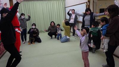 鈴の音と一緒に登場してきたサンタクロースにテンションが上がって近づいていく子がいたり、驚いて泣き出す子がいたりと反応は様々でしたが、サンタさんと一緒に宝さがしをしたりダンスをしたりと楽しい時間を過ごしました。