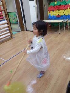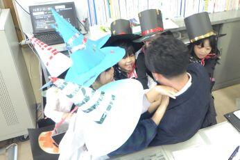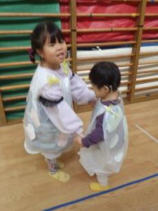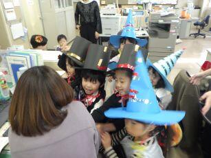 10月31日に、子どもたちがずっと楽しみにしていたハロウィンを行いました。子どもたちはおばけとドラキュラに仮装し、自分で作ったお菓子バッグを持って出発です!大きな声で「お菓子をくれないといたずらするぞ~!」と言い、校内の先生方からたくさんのお菓子を貰いました。バッグはとっても重そうでしたが、最後まで自分で頑張って持っていました。皆で貰ったお菓子を食べて、「魔女のタンゴ」というゲームをしました。お友達と手をつないで踊ったり、ほうきを持って魔女になったりと、大盛り上がりでした。