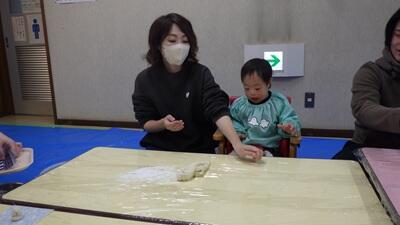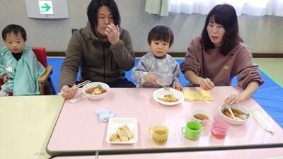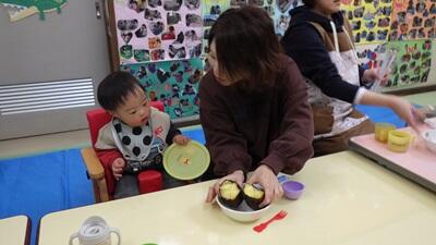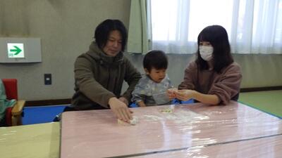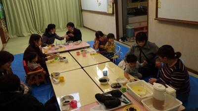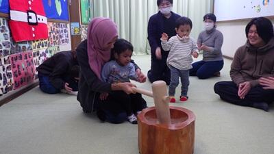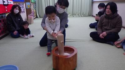 親子が4組参加してくれました。赤ちゃんサイズの臼と杵でついていきます。かけ声は「ぺったん。ぺったん。」 子ども達には、デンプンで作った豆乳もちと、もち無しお雑煮。大好きでパクパクと止まらなくなっているお子さんもいました。