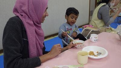 てくてくと元気よく歩いたり、疲れてきたら「ママ抱っこ」とおねだりしたりと微笑ましい様子がたくさん見られました。ランチはママやパパが作ってくれたおいしいお弁当をお腹いっぱい食べました。